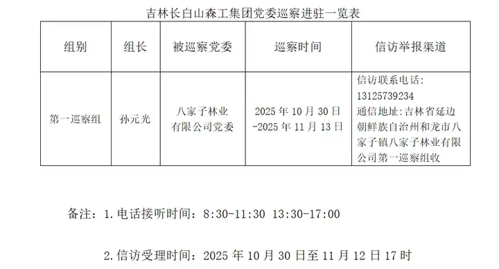本轮巡察现场工作时间15天,期间设立信访举报电话和邮政信箱,主要受理反映所涉及单位领导班子成员和其他吉林长白山森工集团党委管理干部、下一级领导班子成员和重要岗位领导干部的问题举报,重点是关于违反政治纪律、组织纪律、廉洁纪律、群众纪律、工作纪律、生活纪律、中央八项规定精神和国家法律法规规定以及领导干部不担当不作为、群众身边不正之风等方面的突出问题。