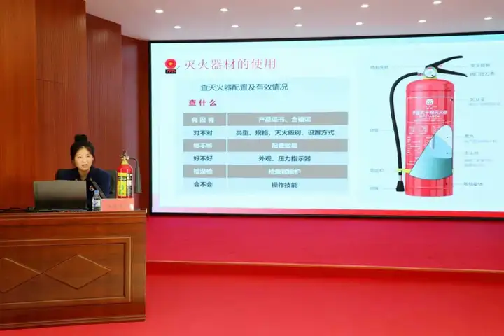 疏散演练结束后,最受关注的灭火实操环节随即展开。消防官兵首先走到演练现场中央,手持干粉灭火器,详细讲解其构造、工作原理及“提、拔、握、压”四字核心操作步骤,并结合现场演示,直观展示了从开启灭火器到对准火焰根部灭火的完整流程,确保每一位参训人员都能清晰掌握操作细节。